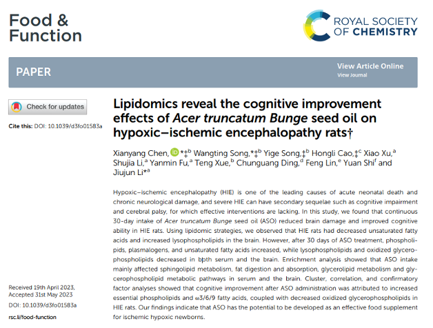 本次研究成果为北京宝枫生物科研团队与中国医科大学儿童医院研究团队合作产出,这已经是其两个月内在国际一区期刊上发表的第二篇重量级论文。2023年7月,两团队在国际一区的科学期刊Food & Function发表了题为“北京宝枫生物神经酸提取物对平原地区HIE新生儿模型具有认知改善作用”的论文,又于2023年9月在Communications Biology发表了本篇论文。这些研究成果说明,无论是平原还是高原地区,元宝枫神经酸提取物(北京宝枫生物公司生产的独家专利产品“木之源神经酸油”,产品专利证书:ZL202010816389.2)或可对缺氧缺血导致的认知、行为能力下降都具有改善作用。
